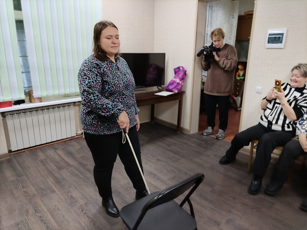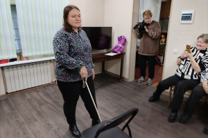 На встрече библиотекарь провела для представителей местного телевидения интерактивный эксперимент. Журналисты с закрытыми глазами прошлись несколько метров с белой тростью, чтобы на собственном опыте понять ежедневные трудности, с которыми сталкиваются незрячие люди.