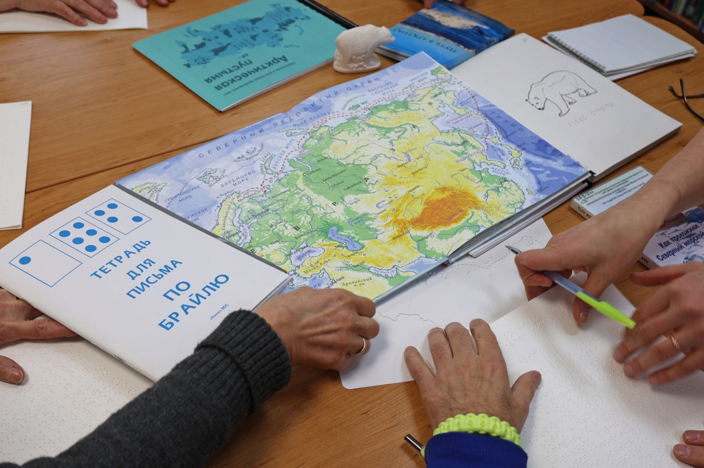 С помощью тактильной карты читатели смогли «пройти» по современному Северному морскому пути — самому короткому и безопасному водному маршруту между европейской частью России и Дальним Востоком.
