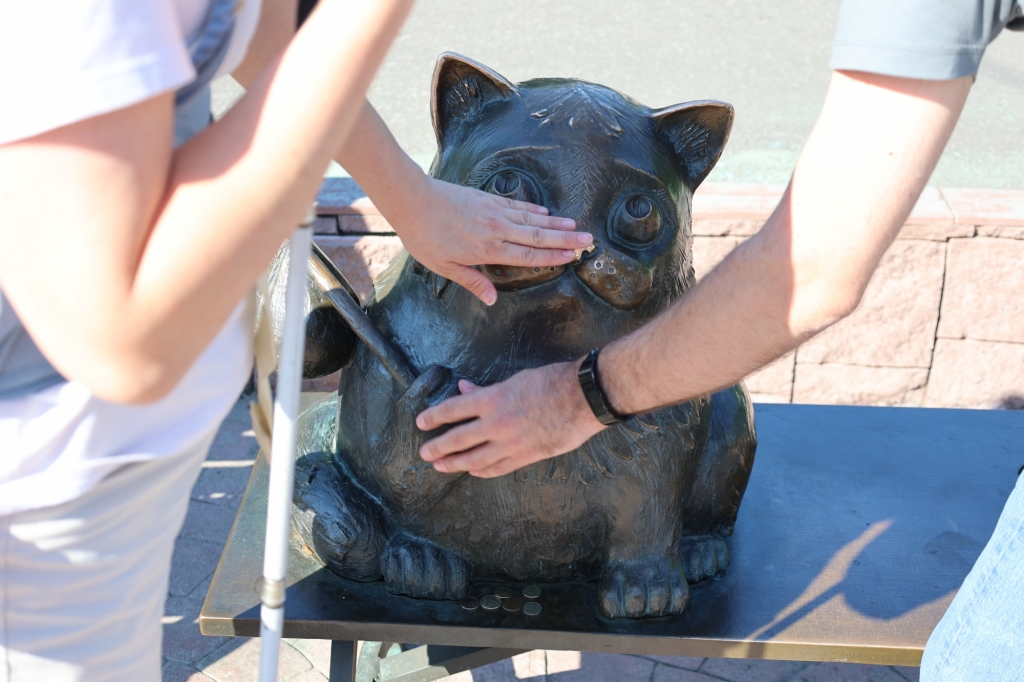 В сквере на главной городской площади Пять Углов путешественники тактильно изучили памятник треске и представили главную северную рыбу в натуральную величину, а также загадали желание, потерев треску за носик.