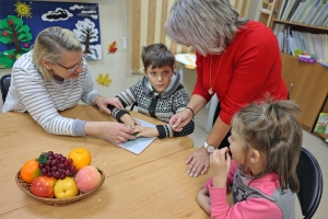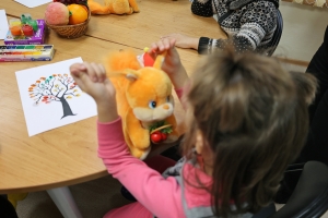 В начале встречи «Здравствуй, лес! Мы попали в край чудес!» специалист библиотеки предложила малышам волшебный ритуал: из яркой цветной бумаги изобразить слово «Осень» и под заливистую песенку похлопать в ладошки, словно приветствуя пусть и осенний, но еще такой теплый дождик.