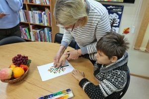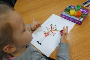 Маленькие гости активно отвечали на вопрос, каких красок больше всего на осенней палитре, и с радостью выводили пальчиками разноцветные листочки на нарисованных деревьях.