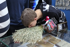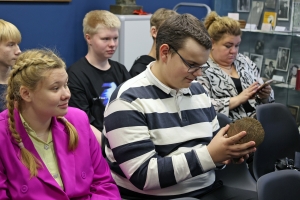 Особенностью экскурсии стала ее доступность для гостей с нарушениями зрения. Марина Геннадьевна предложила ребятам тактильно изучить объемные портреты поэта, включая картонный бюст и рельефно-графическое изображение. Также с помощью тактильного изображения участники представили внешний вид дома Есениных в Константиново, а затем с помощью обоняния «прочувствовали» атмосферу стихов Сергея Есенина – вдохнули аромат настоящей пшеницы.
