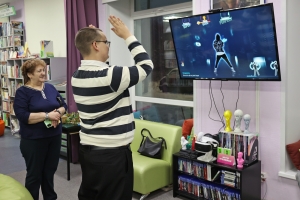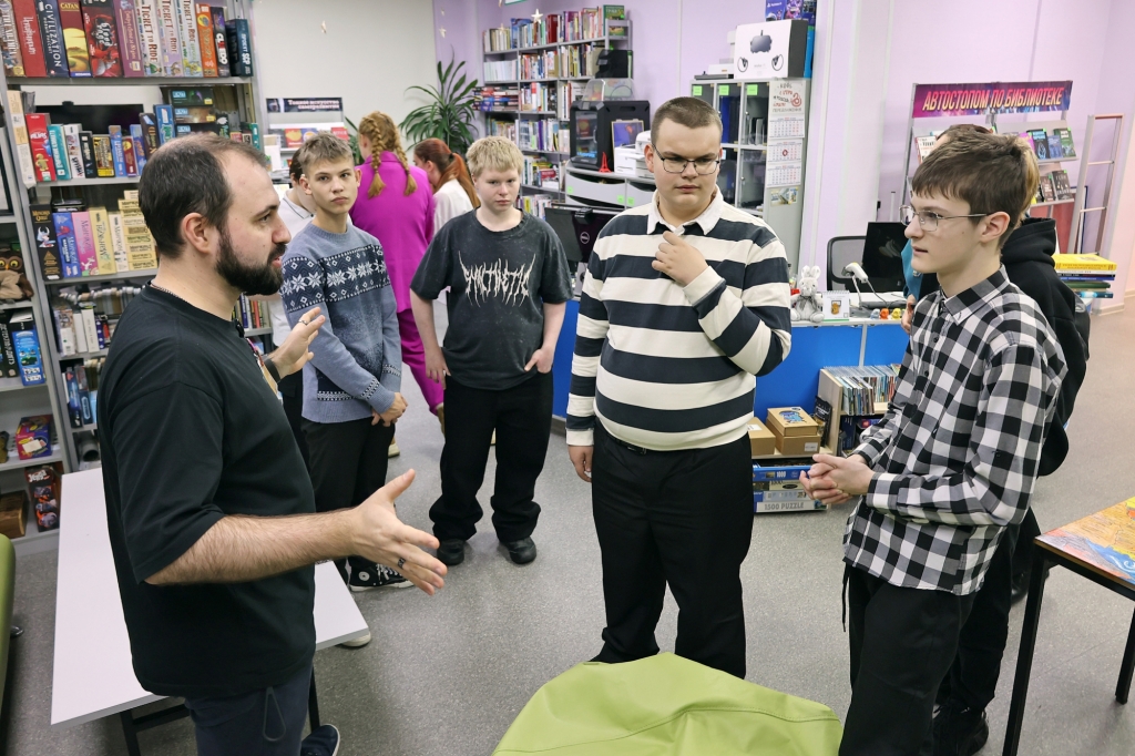 Сотрудник библиотеки Роман Фисенко рассказал ученикам Мурманской коррекционной школы-интерната №3, как после модернизации по модельному стандарту обычная библиотека превратилась в технологичный центр притяжения творческой молодежи. Сегодня здесь есть уникальная коллекция комиксов и атрибутики, настольные игры, шлемы виртуальной реальности, техника для 3D-моделирования, графические планшеты, танцевальная зона и оборудование создания анимации.