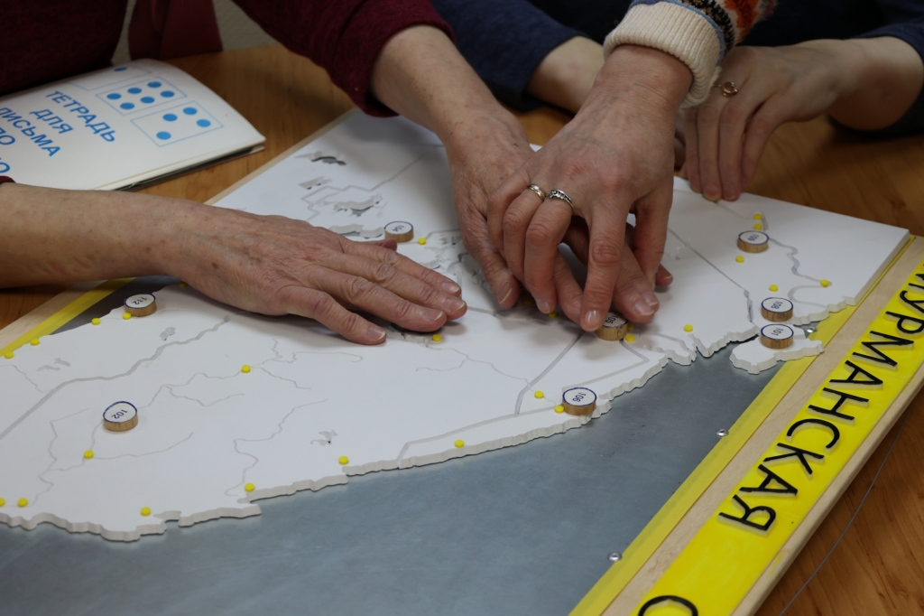 Библиотекари предложили читателям тактильную карту Кольского полуострова из проекта «Заполярье на ощупь» воспитанника Нахимовского училища. Участники клуба на ощупь изучили, где расположены горы, какие города находятся рядом.